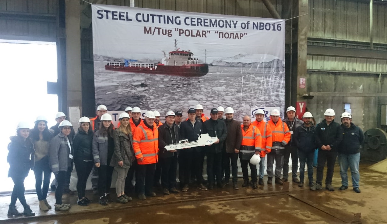 Steel Cutting Ceremony of the first of three (3) unit 73.3m Shallow Draft - Ice Breaker Anchor Handling Tug Supply Vessel have been carried out on 21st of February 2020 by participation of the Owner and ATLAS team.